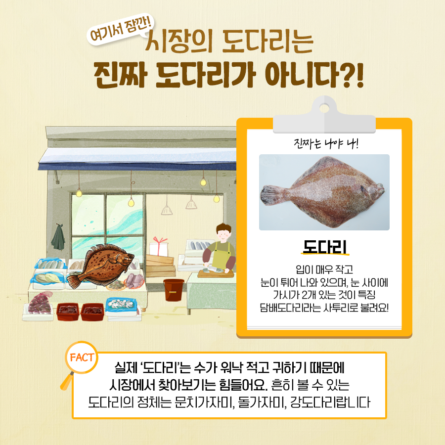 • 혼동 포인트: 시장에서 ‘봄도다리’라 불리지만 진짜 도다리가 아님.