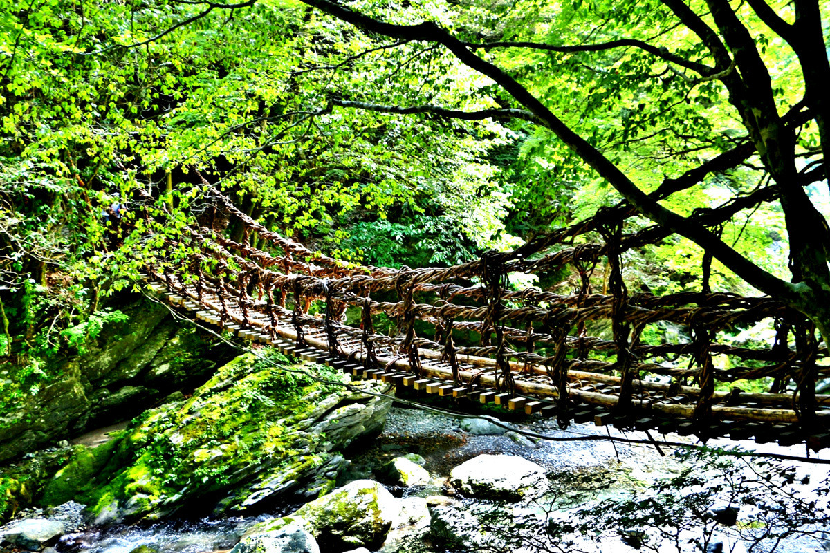 덩굴(시라쿠치카즈라)로 엮어 만든 길이 45 m의 현수교. 일본 3대 기이한 다리 중 하나로 스릴 만점 인생샷 스팟입니다.